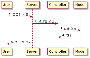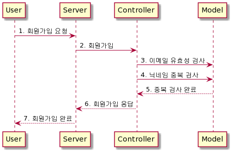 회원가입 시퀀스 다이어그램은 위 그림과 같으며 유저가 Server를 통해 email, nickname, password를 요청하면 서버에서 컨트롤러로 회원가입을 요청 한 뒤 모델에서 이메일유효성과 닉네임 중복검사가 이루어진 뒤 회원 가입이 완료된다는 메세지와 함께 응답 메시지가 전송된다.