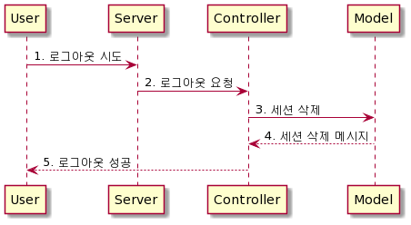 로그인 된 세션의 유저는 Server에 로그아웃 시도를 Post하면 Controller를 거쳐 Model에 존재하는 해당 유저의 세션값을 삭제하여 로그아웃이 이루어진다.