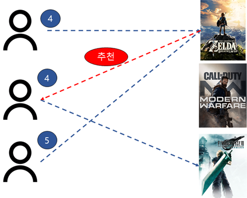 GameLog 프로젝트는 Home, Library, wishlist, search탭바로 나누어 서비스를 제공한다. Home은 인기 게임 가장 높은 기관의 수와 평점을 가진 게임을 나타내며 추천 게임은 해당 유저의 데이터를 통한 게임을 추천한다. 카테고리별 게임은 유저가 회원가입시에 기입한 선호하는 장르의 게임들을 나타낸다. Library는 유저가 하고 있는 게임, 끝낸 게임 등 유저의 게임 기록을 남길 수 있는 곳이며 게임 평가, 리뷰, 상태 저장, 정렬 등의 기능을 제공한다. Wishlist는 사고 싶은 게임을 저장하며, 이름순, 출시일 순, 점수 순, 담은 순으로 정렬하는 서비스를 제공한다. Search는 게임을 검색하는 기능을 제공하며 영어, 일본어, 한국 등 여러 언어로 검색하여 유저에게 제공한다.추천시스템은 기본적으로 콘텐츠 기반 필터링(content based filtering)방식과 협업 필터링(collaborative filtering)방식이 있습니다. GameLog 프로젝트에서는 User-based collaborative filtering 시스템을 이용하고 있습니다. 해당 알고리즘은 아이템 자체의 정보 없이 추천이 가능하며 알고리즘이 간단합니다. 하지만 유저-아이템의 양이 많아질수록 연산이 복잡해지며, 컴퓨팅 자원 소모가 증가하는 단점이 존재하며, 신규 가입자의 경우 아이템이 없어 유저간 유사도를 구할 수 없는 Cold start 단점이 존재합니다. User-based CF(Collaborative Filtering)의 예시로 위 의 그림과 같이 세명의 유저가 있다고 가정한다. 1번 유저는 1번 게임에 4점의 평가를 주고 2 번 유저는 3번 게임에 4점, 3번 유저는 1번 게임에 5점을 부여했다고 가정합니다. 이후 연산을 통해 유사도를 구하여 2번 유저에게 1번 3번이 고점을 준 게임 아이템 기반으로 특정 유저에게 추천을 해주는 서비스입니다. 초기 Cold start문제로 인해 해당 IGDB 데이터를 이용하여 몇몇의 카테고리별 랜덤 데이터를 활용하여 평점 데이터를 활용합니다. 이후 서버 데이터베이스에 저장하여 해당 평점 데이터를 활용하여 유저 라이브러리의 평점을 이용하여 해당 유저에게 추천을 하게 됩니다.