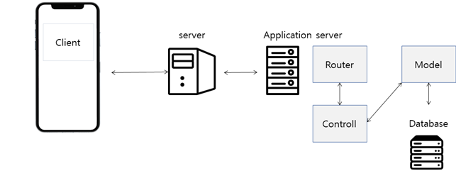 Client측에서 API의 주소에 요청을 보내게되면 nginx를 통해 server_name에 따라 api인지 웹 서버인지 다르게 요청을 받는다. Applcation server로 요청을 진행하게 된 경우 router를 통해 요청에 대한 응답을 전송하며 해당 요청은 control에 존재하는 module을 활용하여 Model 단에서 쿼리를 사용하여 Database에 요청을하고 응답에 대한 데이터를 다시 Controll과 Router로 전송하여 Client에게 요청을 응답하는 아키텍처로 구성되어 있다.