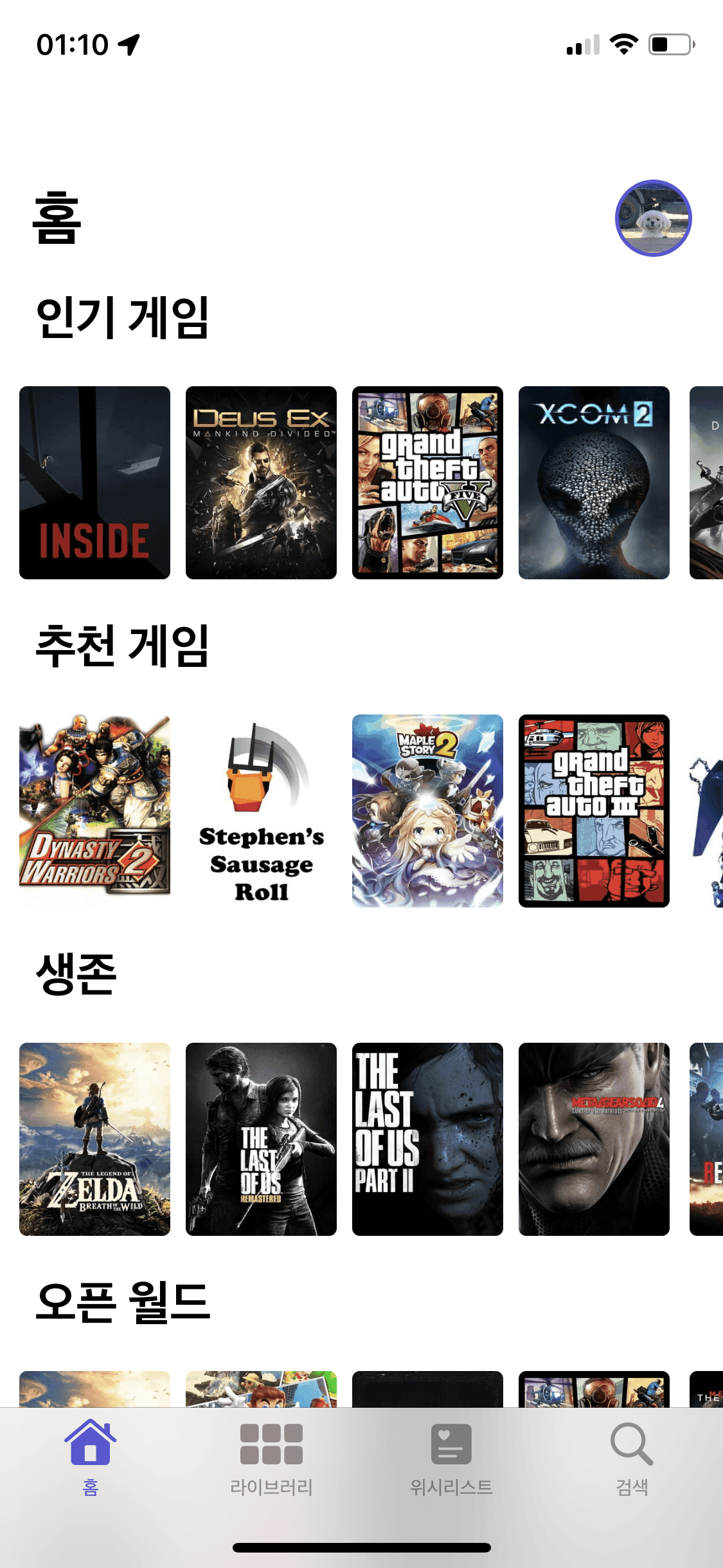 GameLog 프로젝트는 게임 평가, 기록하며 사용자 기반으로 게임을 추천하는 서비스를 제공하는 Native iOS 어플리케이션이다. TabBar를 기준으로 홈, 라이브러리, 위시리스트, 검색의 기능을 제공하며, 추천서비스는 user-based 기반의 추천 서비스를 제공한다.