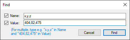 If Name and Value contains an equal number of ,, it will split them up and search for a node containing all of them. So, for example to find the node for a block with certain coordinates, you can search for Name "x,y,z" and Value "404,82,475".