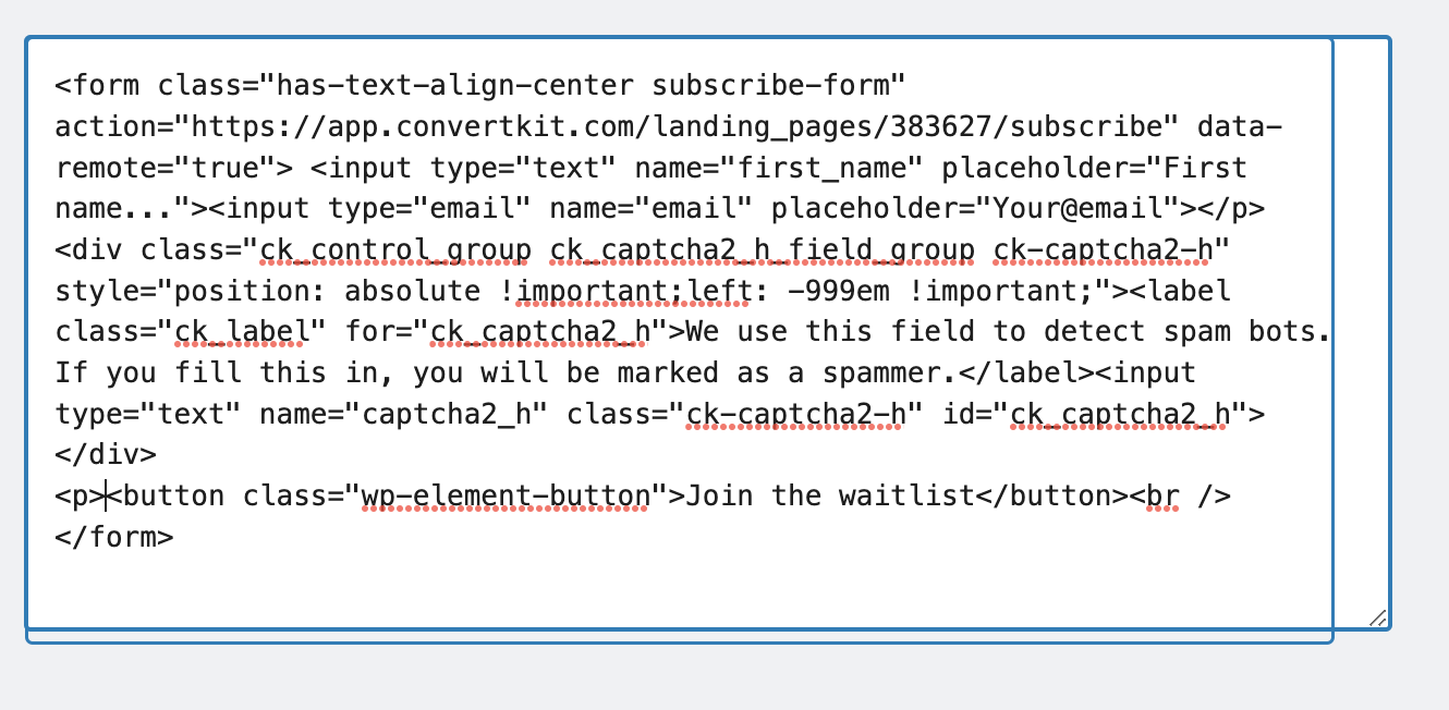 <div class="ck_control_group ck_captcha2_h_field_group ck-captcha2-h" style="position: absolute !important;left: -999em !important;"><label class="ck_label" for="ck_captcha2_h">We use this field to detect spam bots. If you fill this in, you will be marked as a spammer.</label><input type="text" name="captcha2_h" class="ck-captcha2-h" id="ck_captcha2_h"></div>