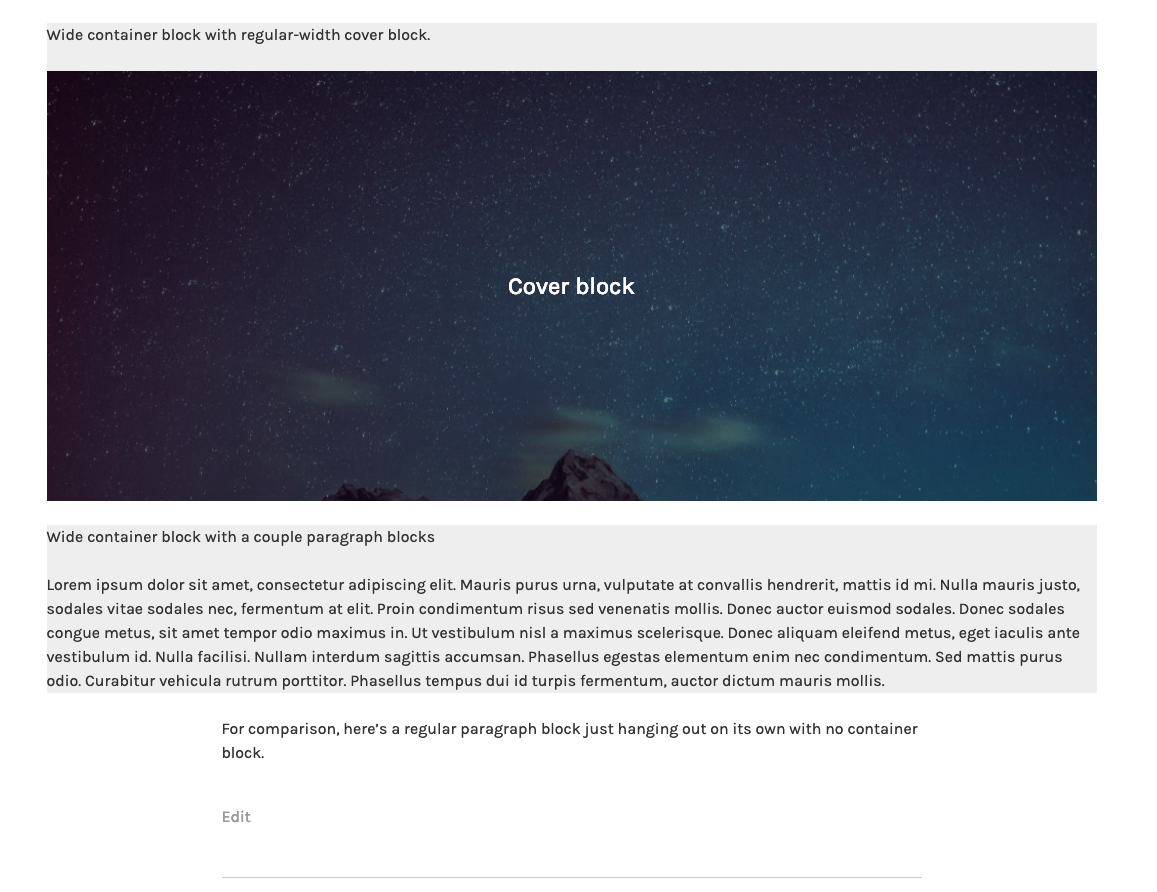 I've been playing around with this a bit with a couple of themes from WordPress.com that have Gutenberg styles. It's very cool! Just wanted to add something else to consider for themes: in my testing, the blocks inside of the container block inherited its width on the front-end: This may not happen in all themes -- it would depend on how they're handling the wide alignments. I was able to recreate in themes using two different methods: one using a max-width for the content area, with the wide blocks styled to flow outside of it (Lodestar, in the screenshot above), and another that sets a max-width on individual blocks when they're direct descendants of the content area container (Photos). I am guessing this isn't the correct behaviour based on the editor preview, so themes may need to re-set a max width for blocks nested inside of wide container blocks when they're not wide themselves. |