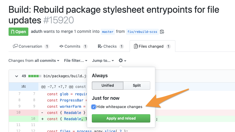 Review with white space changes hidden (
