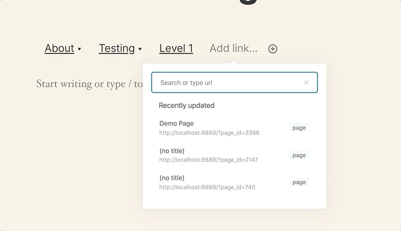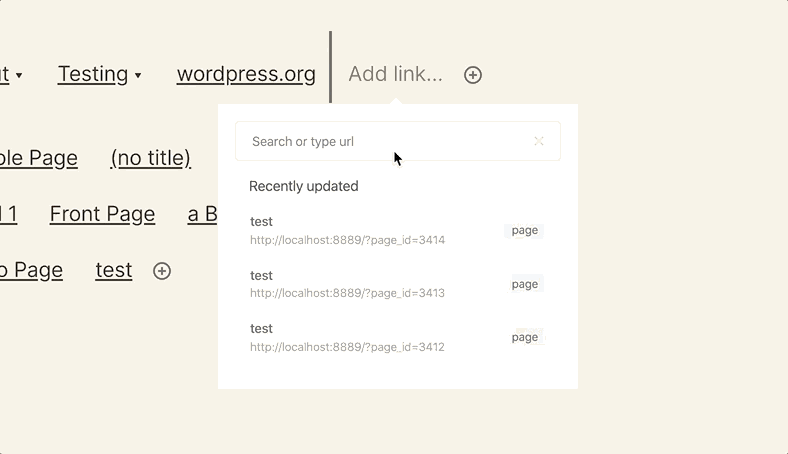 @WunderBart @getdave I opened this draft PR to play around with. Feel free to take it over, abandon, or do whatever you'd like to it :) It adds an This implementation isn't an improvement though, IMO, as if you hit Enter, it will update the label to the link. I'd rather it bring up the matched Page than search the URL. It looks like it used to search the label (ie About instead of localhost:8889/etc) If we could go back to that implementation, this could possibly be good to go. |