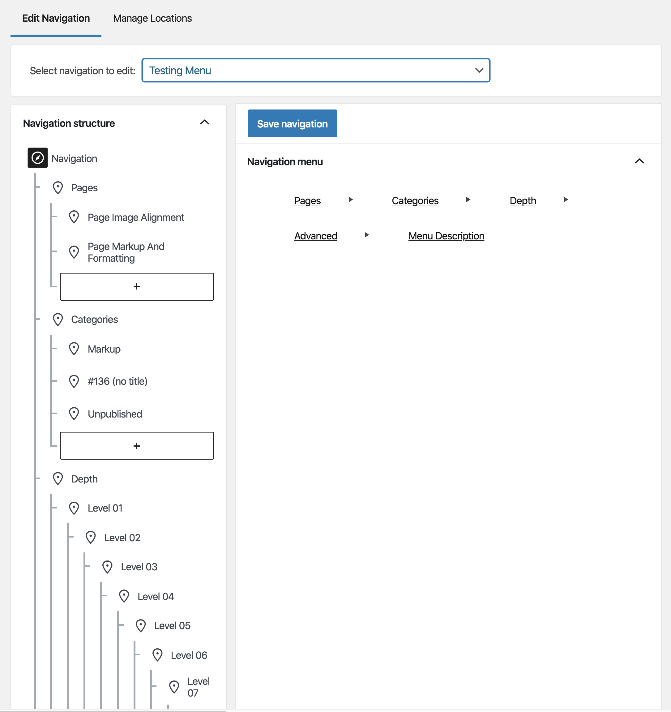 Added ability to render submenus as nested, and save nested items, in the experimental navigation page.