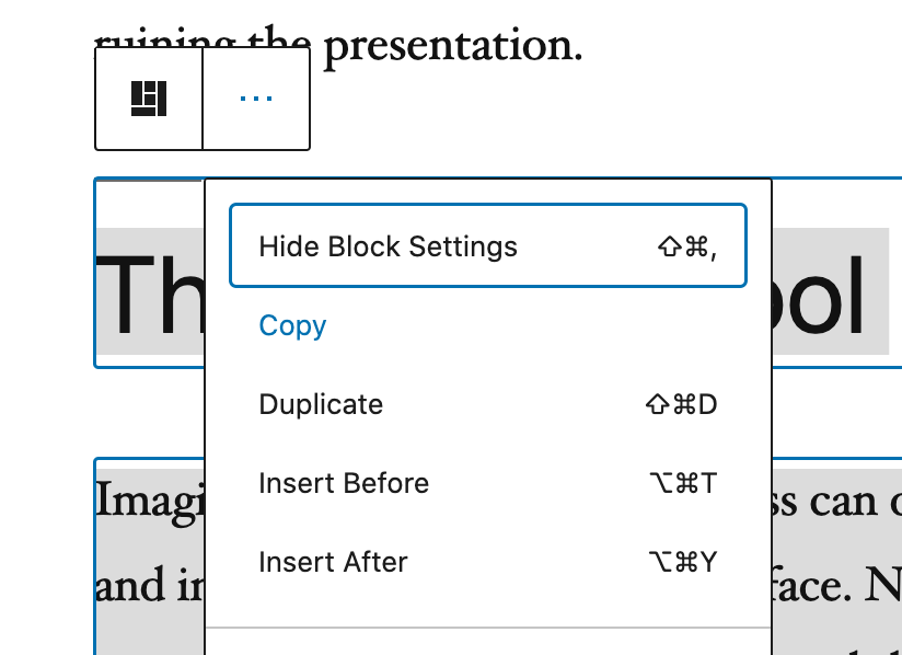 I think it could be useful to add the shortcut in the block menu, but I'm planning to refactor ClipboardButton first because that component cannot be used for any button component. So I'll add it in a follow up, but I think this by itself is already useful.