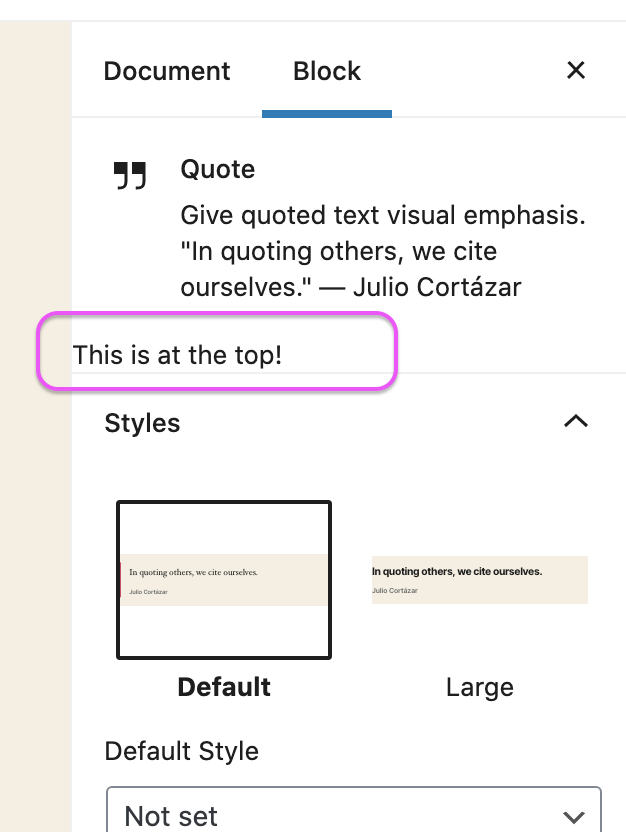 addFilter( 'editor.BlockEdit', 'core/image', myEditComponent, 20 );I saw the text This is at the top! appear above the block styles in the block sidebar.