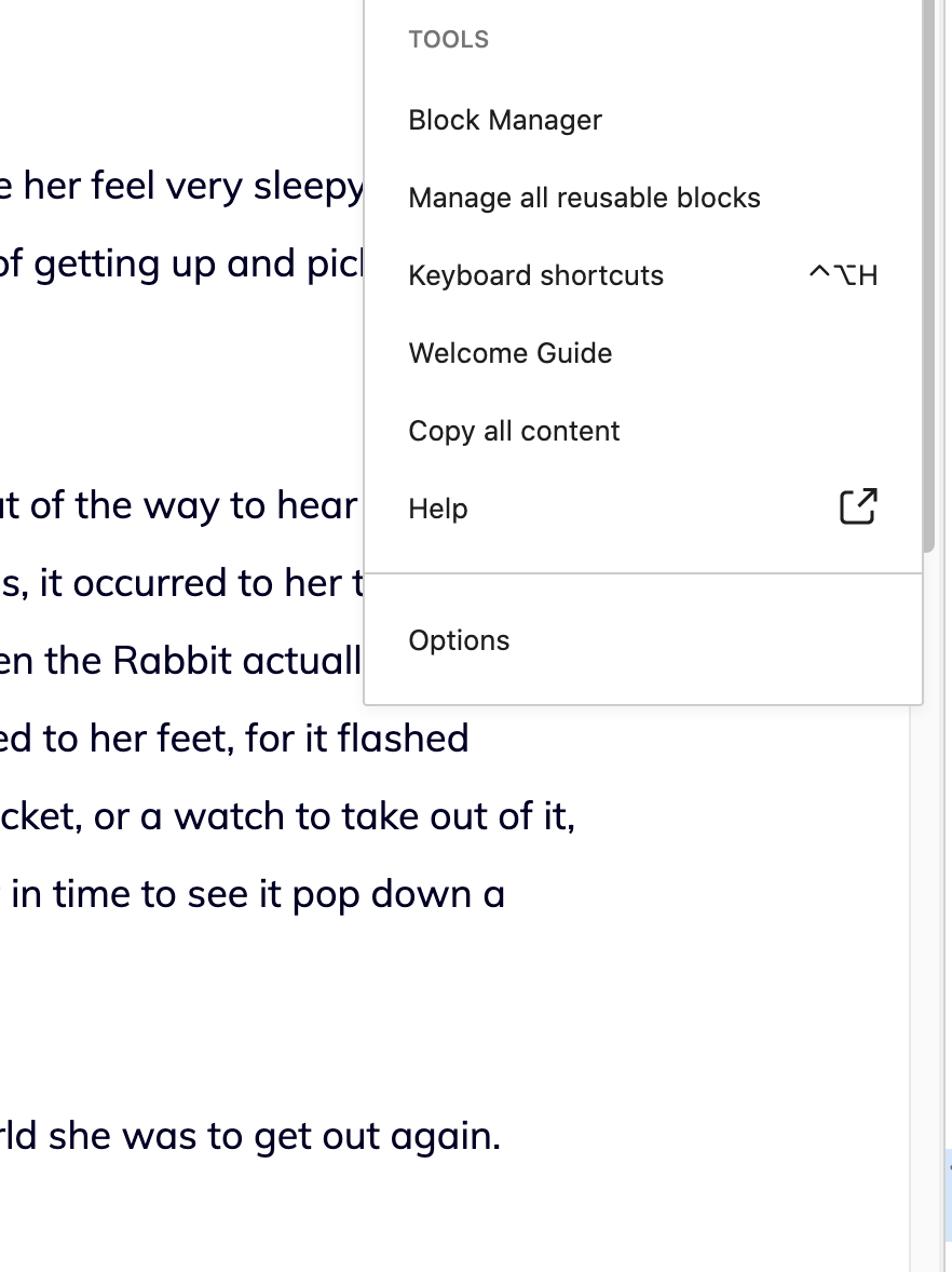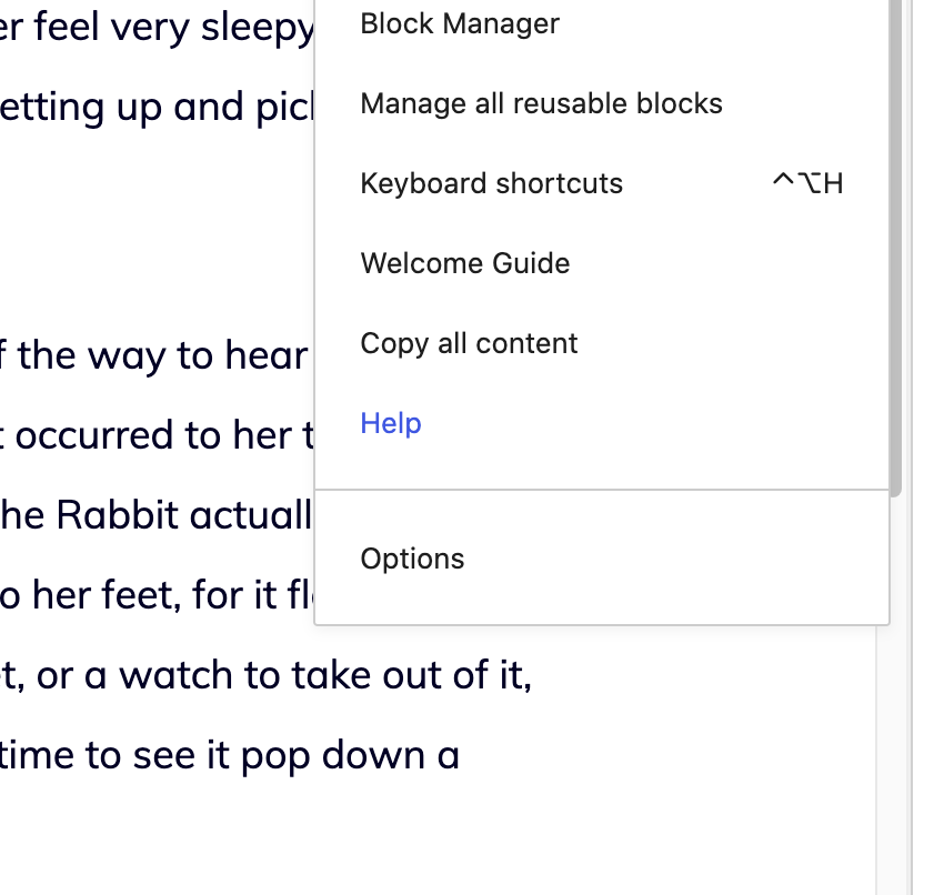 I find it a little weird, both visually (it feels unbalanced) and conceptually (the left-side space is usually reserved for the checkmark). I think it'd be better placed inline, to the right of the text, but I don't have a strong preference. I think an ideal solution is to not open an external link directly from the menu. Instead, I'd expect a help modal to appear within the editor — and from that modal, I'd find general guidance along with links to external resources. |