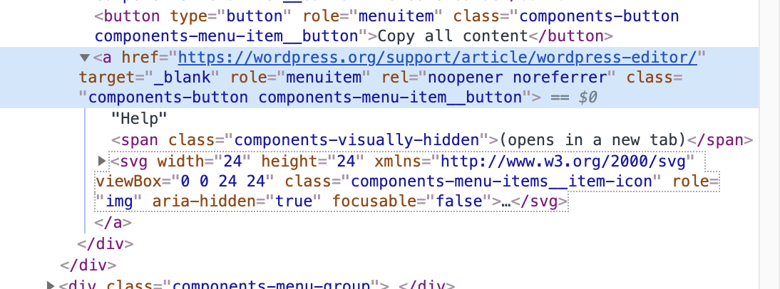 icon={ external }) to the Help MenuItem for edit-post and edit-site plugin. Adding as an svg was important because when i referenced it only as a string (icon="external") it creates a Dashicon, which is 20x20 pixel big, it would break the padding of the text. The default icon size is 24x24 pixel and fits perfect into the more option menu.How has this been tested?