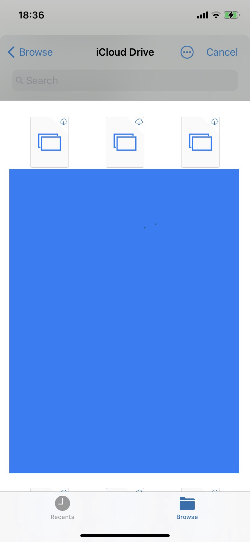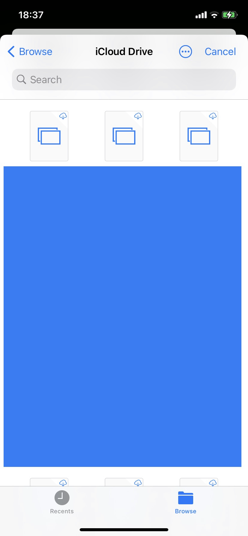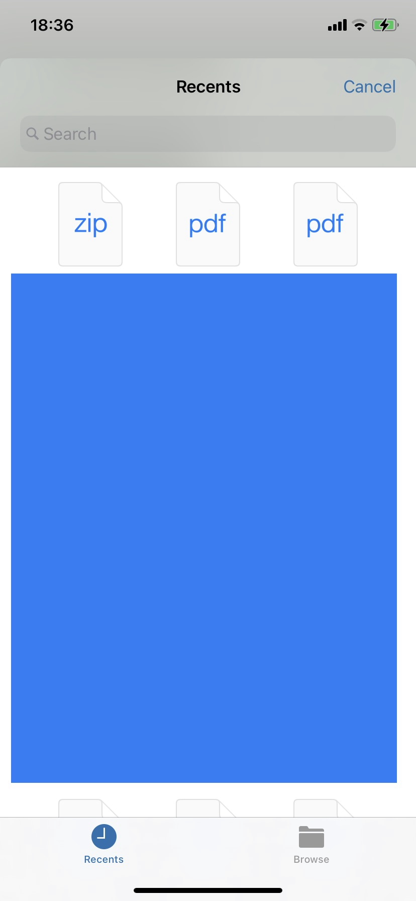 Tested images (HDR photos don't work, but I noticed they're not allowed on the web, so that's probably OK — JPEGs worked), tested video and MOV was greyed out, tested audio (WAV and AIFF) but both appeared greyed out in the iOS file picker, tested PDFs and they worked fine.
