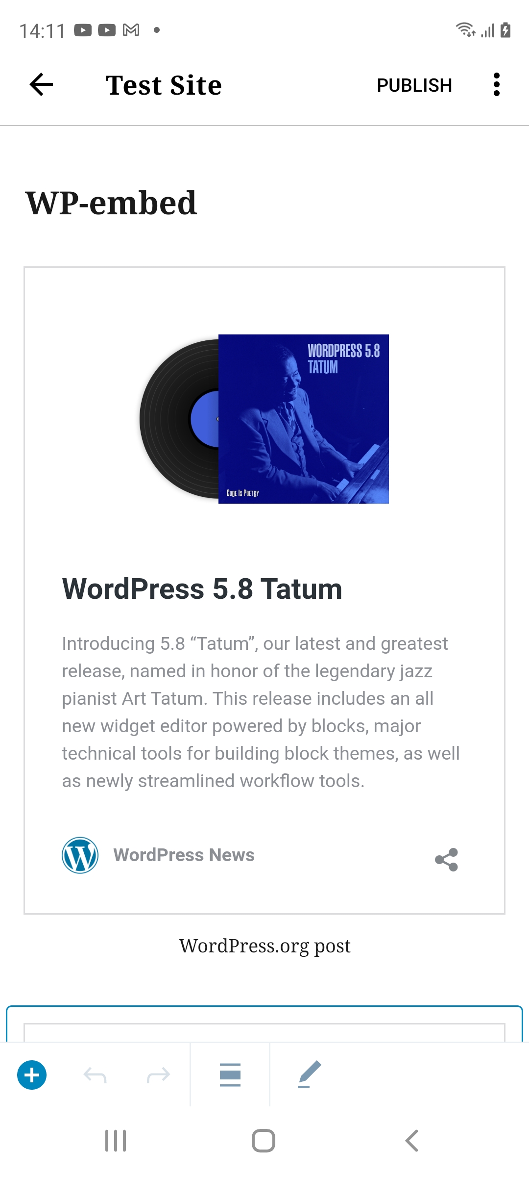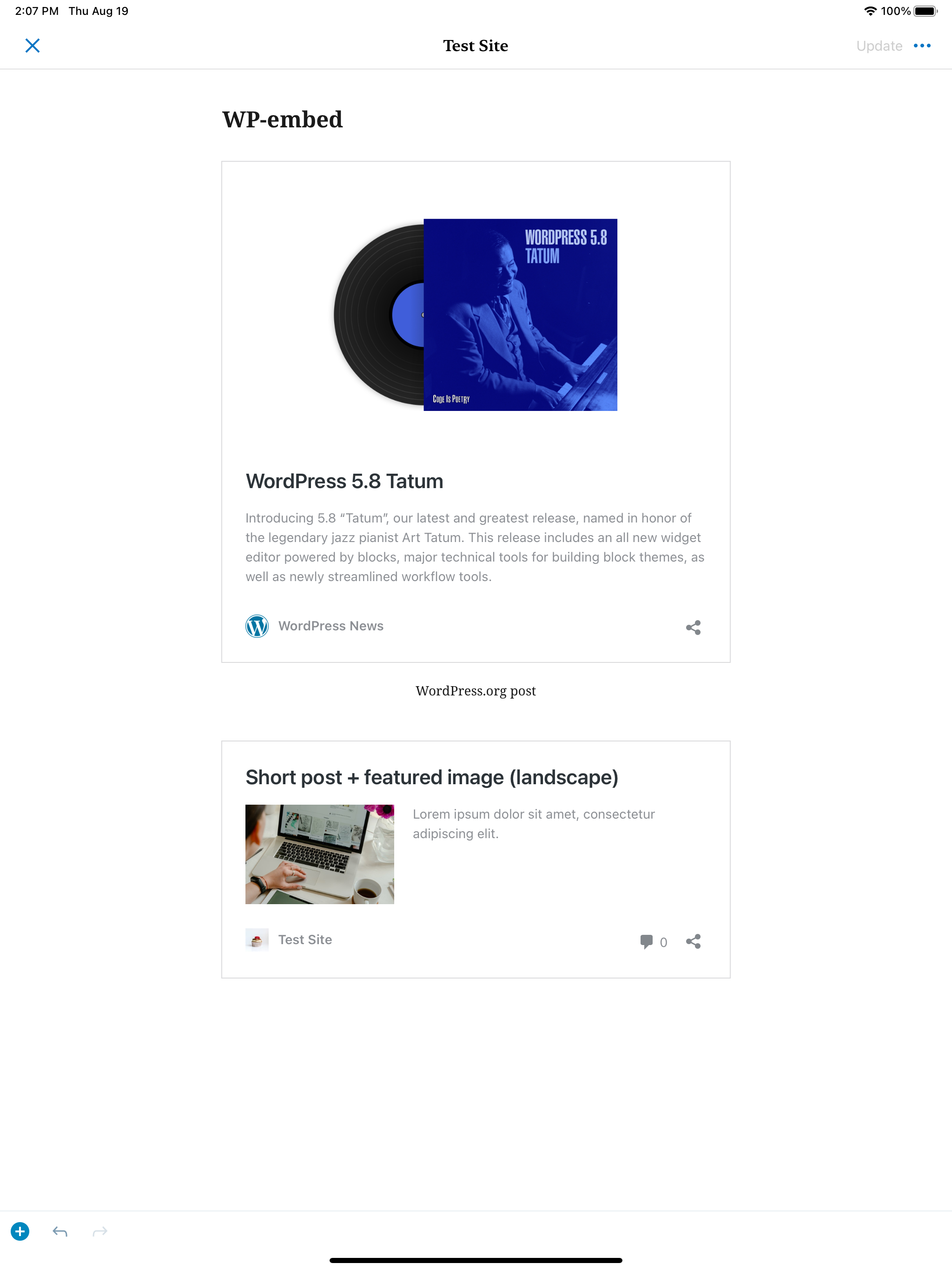 After that I was able to test it using WPiOS and WPAndroid. I tried rotating the devices to test resize logic and also tested alignment options. I've tested with a WP post URL from the same site creating the post itself. I've also tested YouTube embed again as well to check if previously injected JS and component behaviour isn't changed.