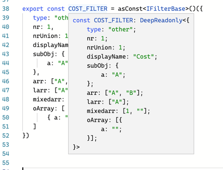 as constis that it provides no autocompletion or type constraints to the developer writing new typesThat's true! It is the price to pay for having a single source of truth. I think it's a worthy trade-off, but there may be a way that enables both using a clever trick I found on StackOverflow: