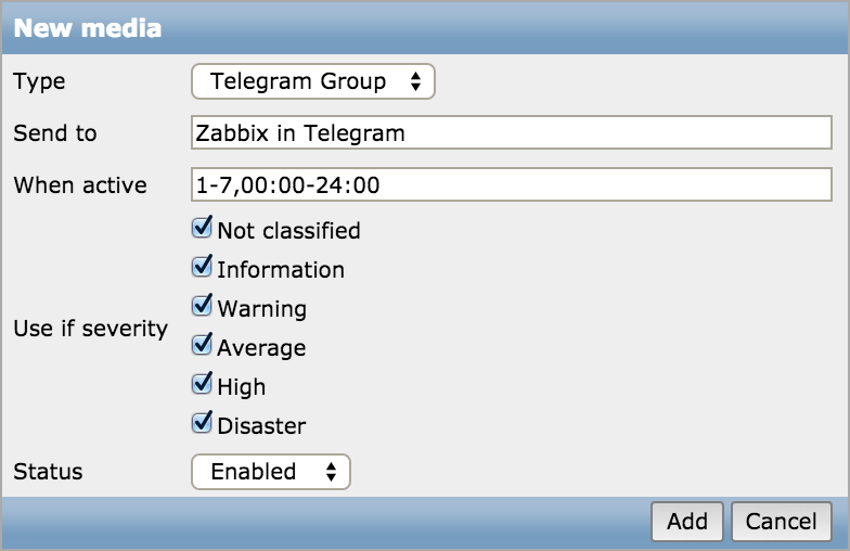 zbxtg_settings.pyif you need an internet proxy (socks5 supported as well, the wiki will help you) - Add new media for Telegram in Zabbix web interface with these settings: