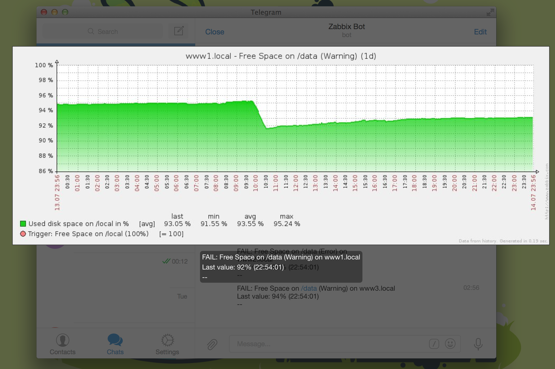 zbxtg_settings.py(copy it fromzbxtg_settings.example.py) with your settings and save them in the same directory as the script, see example for layout - Create a bot in Telegram and get API key: https://core.telegram.org/bots#creating-a-new-bot