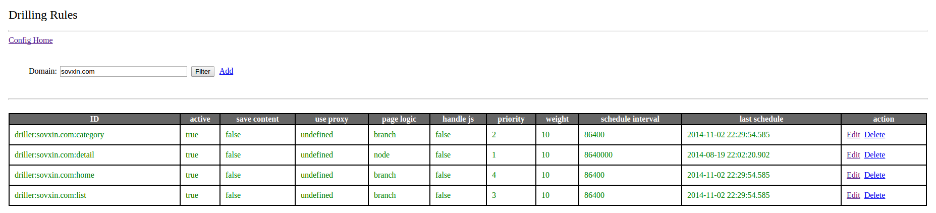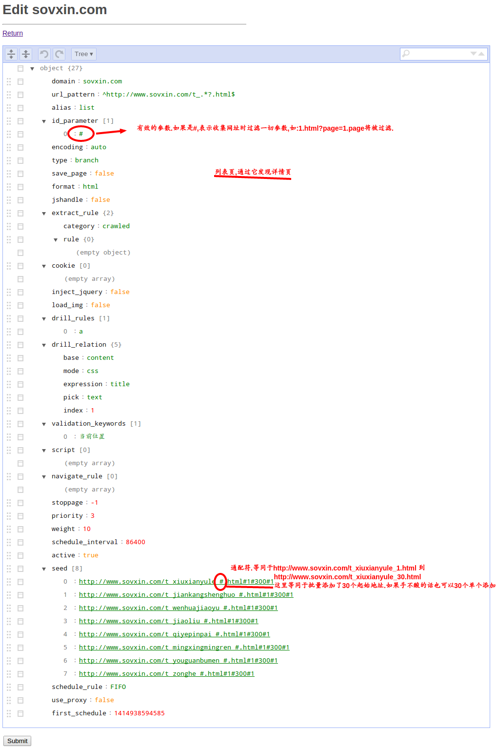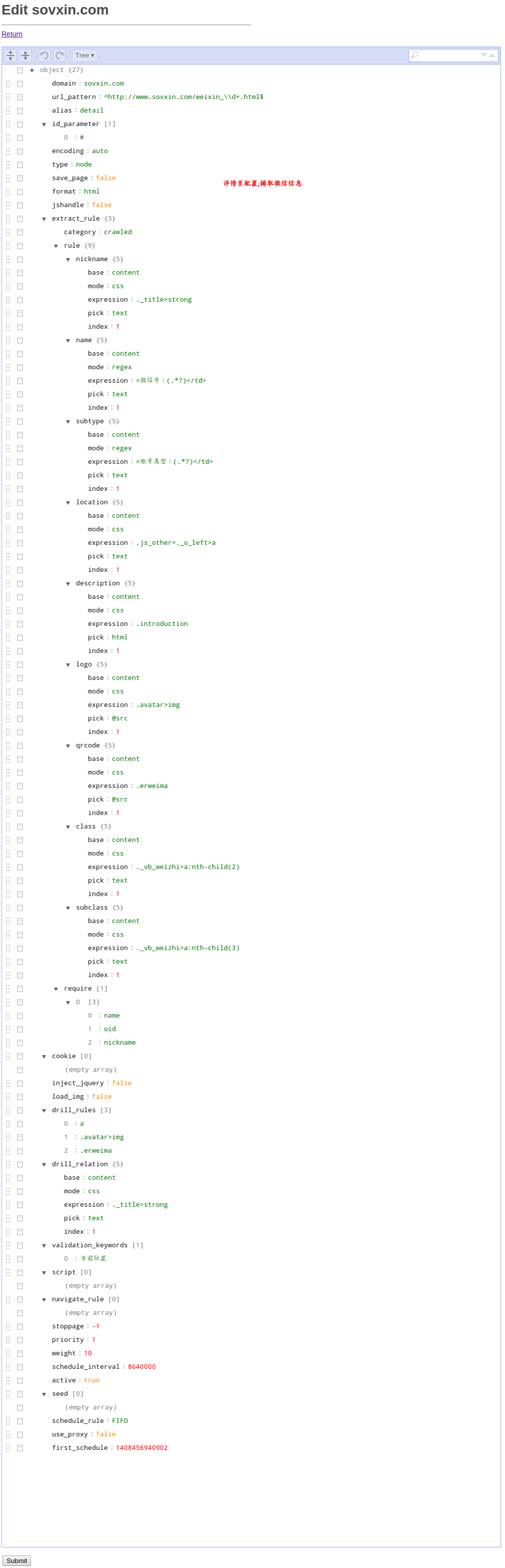 ##【抓取规则配置】 打开web界面,例如:http://localhost:8888/ , 进入“Drilling Rules”,添加规则。这是一个json编辑器,可以在代码模式/可视化模式之间切换。下面给出配置项的说明.具体的应用配置可以参考下一章节的示例.