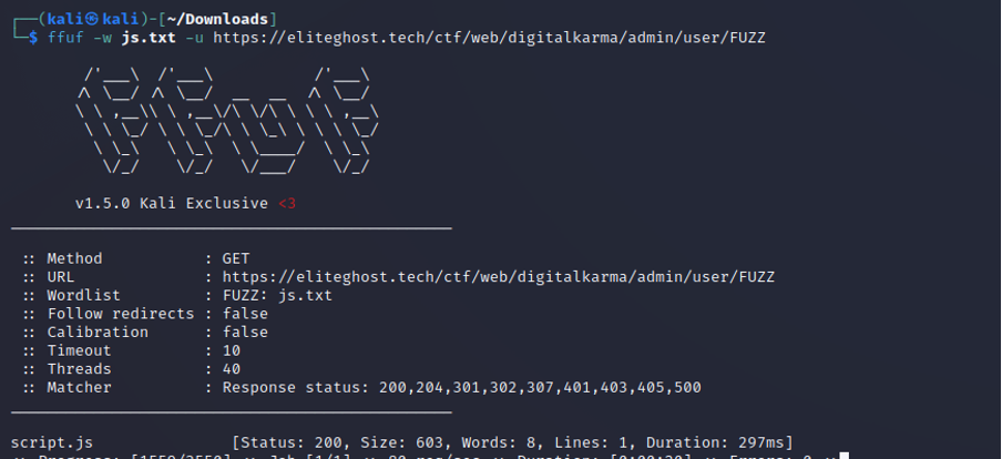 From the hint, we know that there is js script somewhere. So we can fuzz recursively for js file using ffuf with this wordlist at admin/user/ and admin/pass/. Aha, we got a hit at admin/user/ there is a file named script.js