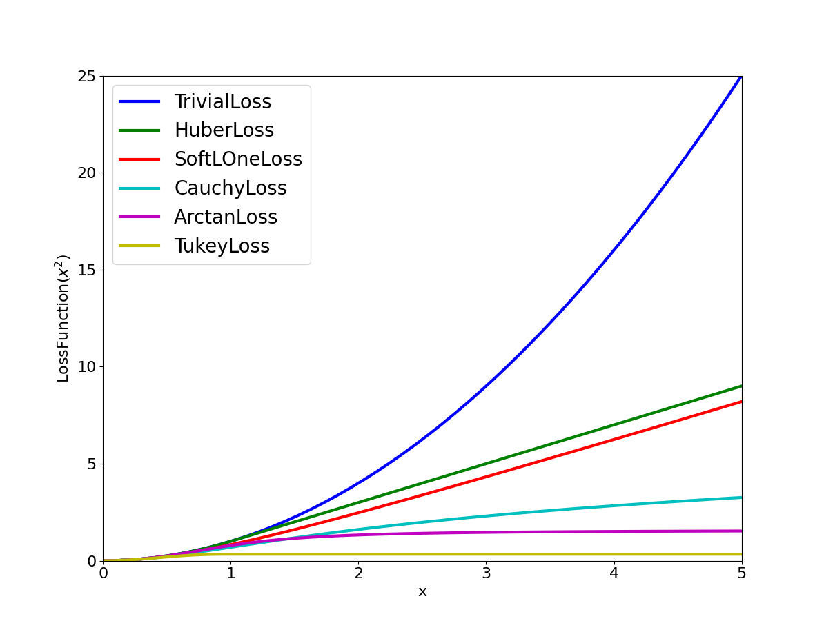 Example Loss Functions available in Ceres SolverFor additional information, see the Loss Function section of the Ceres Solver documentation.