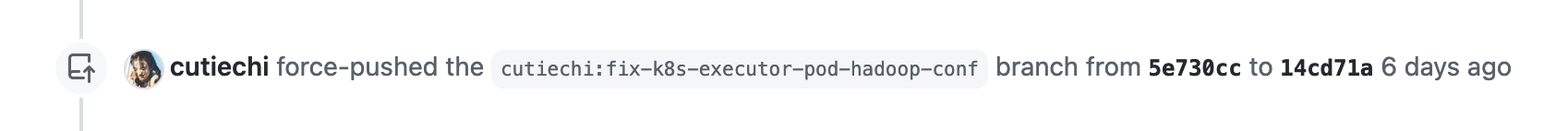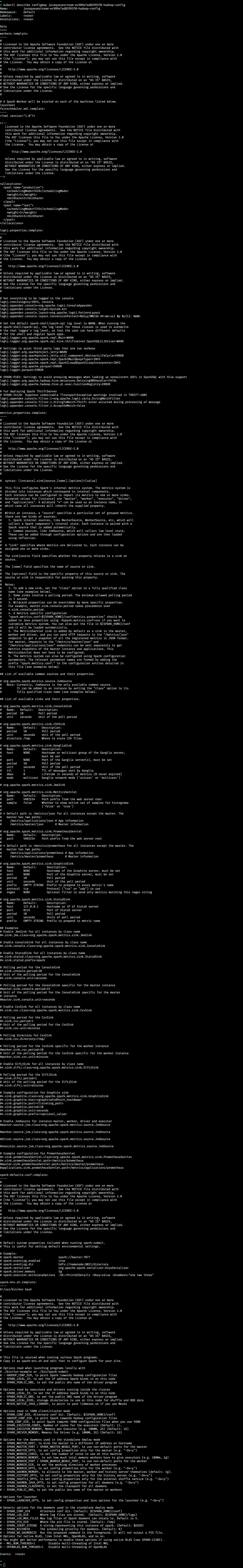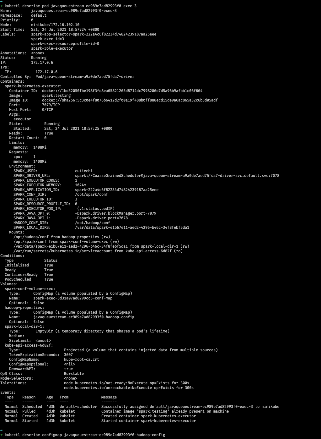I recompiled the code of the current branch and re-tested according to the following command: But the result is different from yours, all pods are running normally Pods: One of the executor pod: Hadoop properties ConfigMap of this Pod: Did you pull the latest code and recompile and test it? Please help me review again, thx |