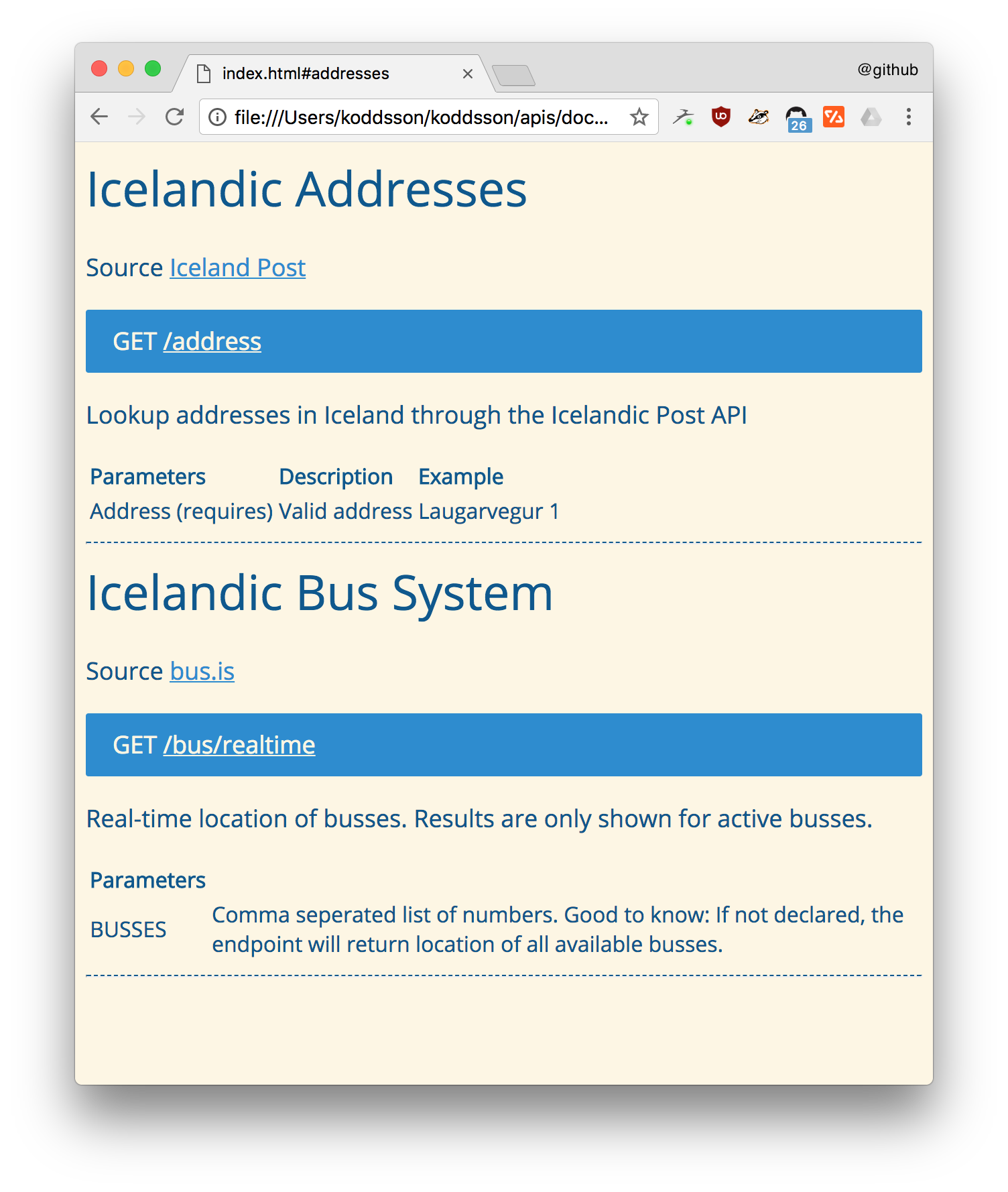 @MiniGod Sure! Since apis.is is CORS enabled we can just add some javascript to fetch the resources. Since the markdown standard allows arbitrary HTML we can basically do everything we want in the docs. |