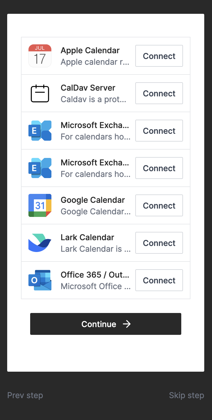 Adds a continue step button for connect calendar step on getting-started page.