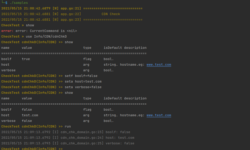 ./samples cdnChkD --boolf test.com false - 普通交互模式: