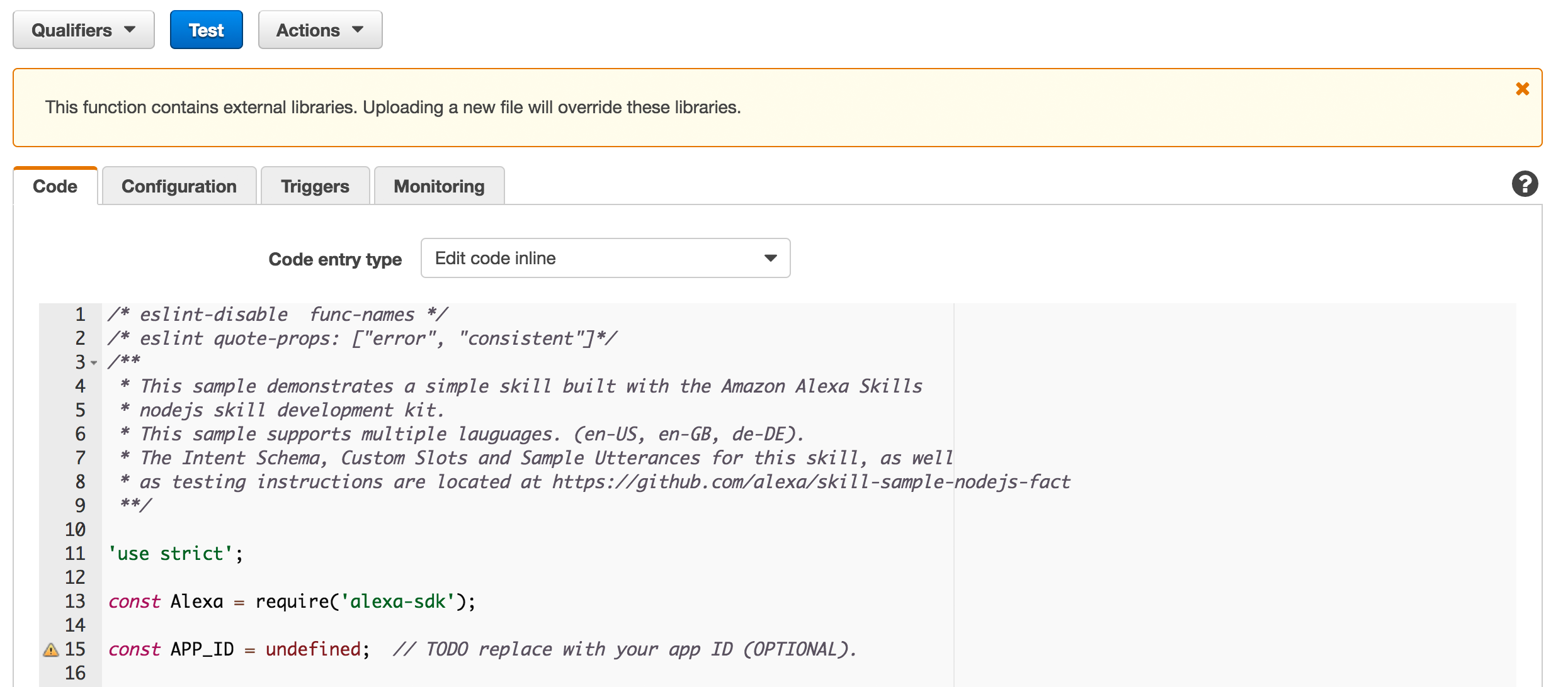 If you've downloaded your code to use your own editor, log back into your AWS console and copy-and-paste the contents of your index.js file to the Code tab of your Lambda function.