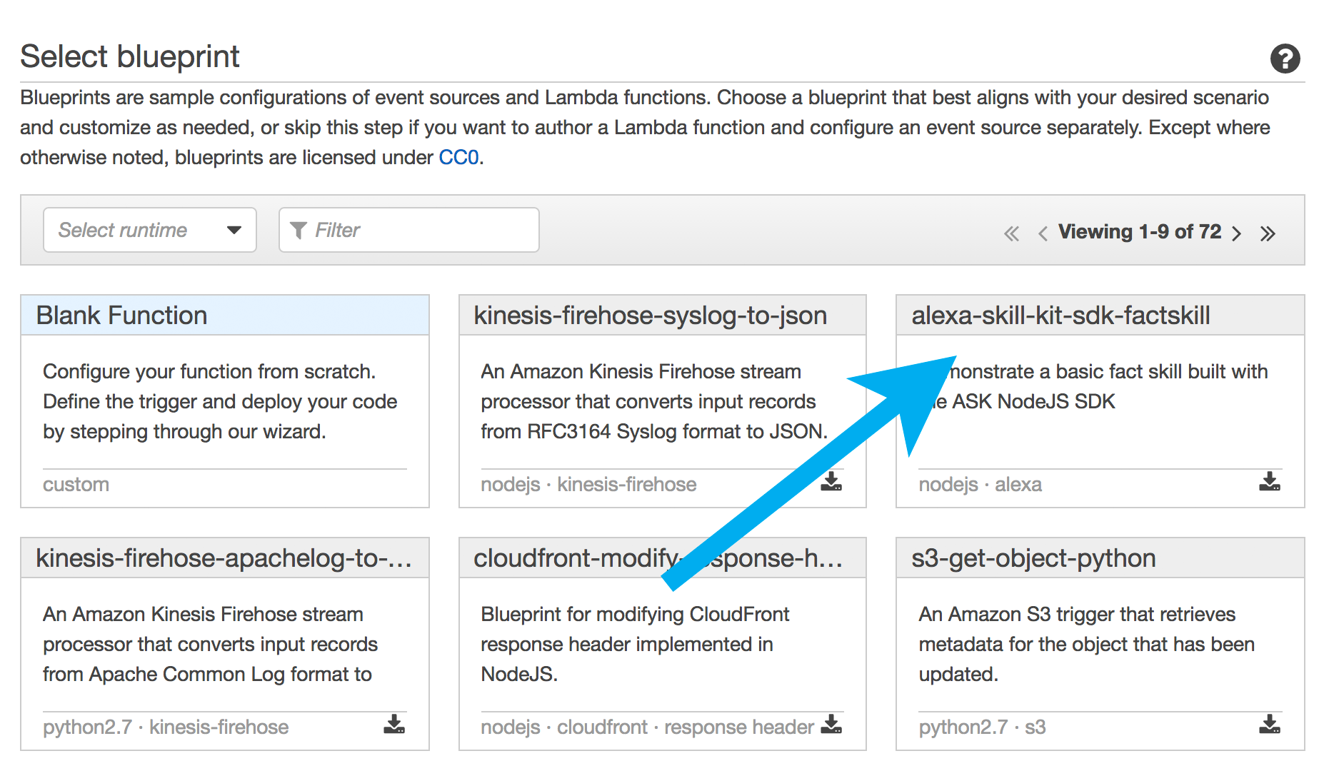 - In the ‘Select Blueprint’ page, filter on 'Alexa', select “alexa-skill-kit-sdk-factskill”. This blueprint is a shortcut to getting the Fact Skill set up for you, and will install the sample code (and dependencies) that are needed for this project.