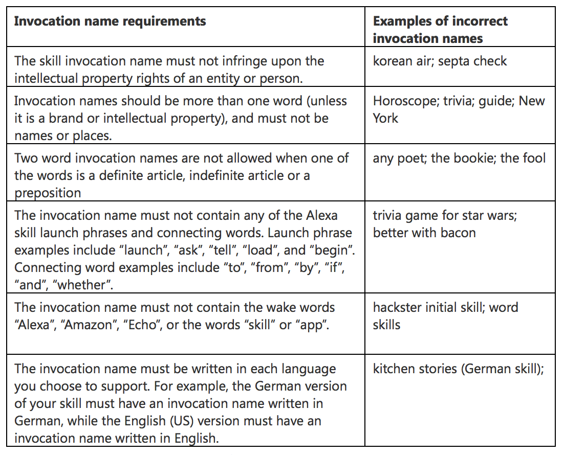 - Come up with a cool Invocation Name that users will use to invoke your skill. Ensure that the invocation name you choose stays clear of pitfalls listed in the table below. Column on the right provides examples of invocation names that will definitely fail certification.