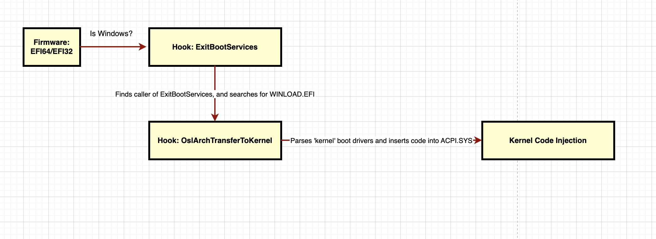 After initial insertion into a UEFI driver firmware using the the injection utility, the shellcodes EfiMain achieves execution as the host starts up, and inserts a hook into the UEFI firmware's ExitBootServices routine. The ExitBootServices routine will then, on execution, find the source caller of the function, and if it matches WinLoad.EFI, attempts to find the unexported winload.efi!OslArchTransferToKernel routine, which will allow us to attack the booting kernel before it achieves its initial execution.