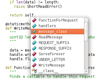 Pyqtc statically analyses your Python code as you type and offers code completion suggestions automatically after a period (.), or after pressing Ctrl+Space.