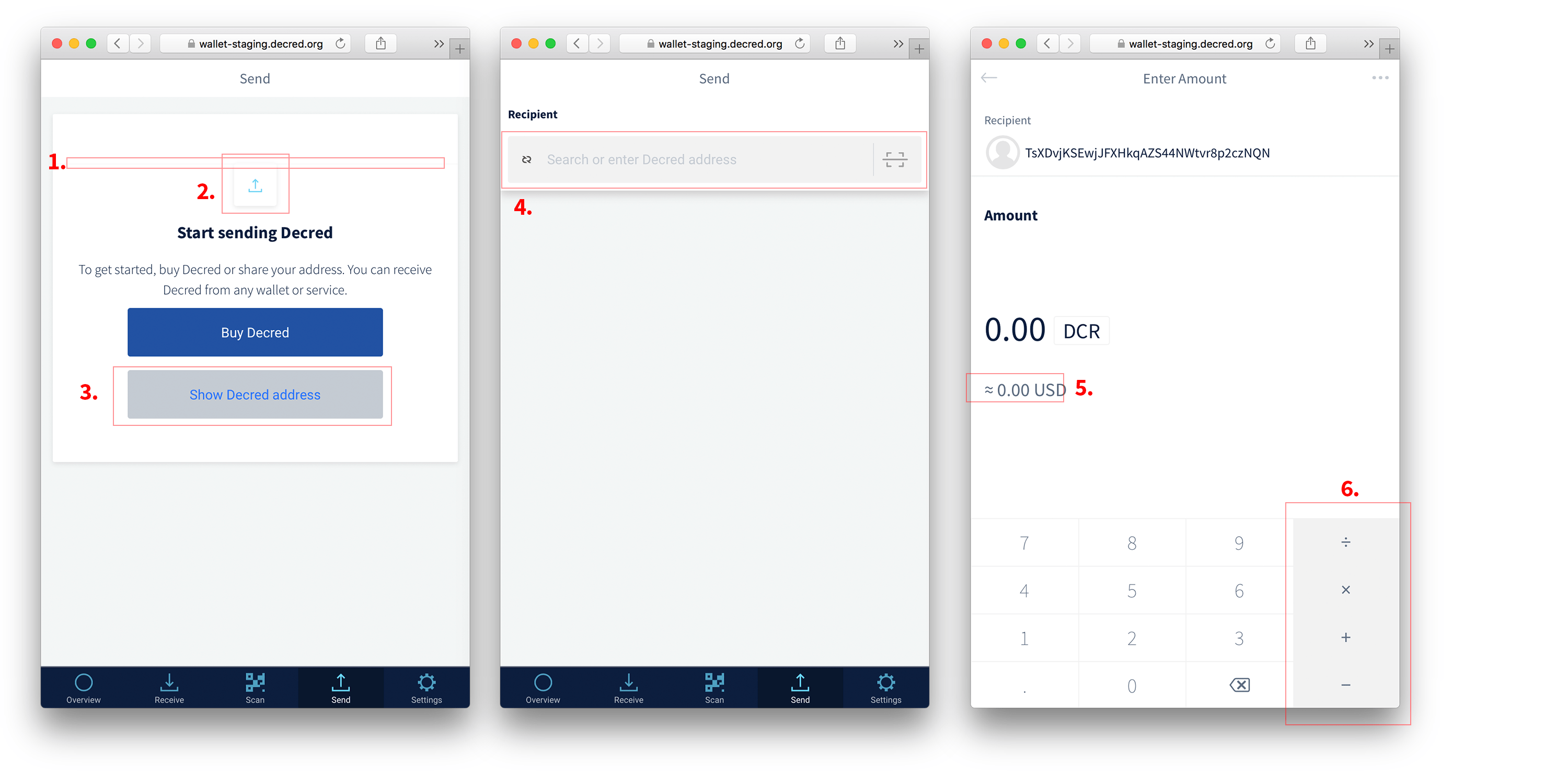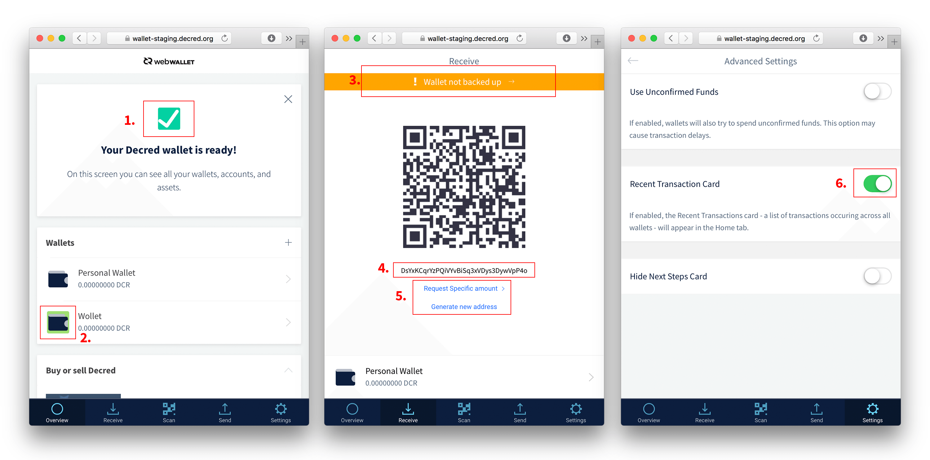 - 3. Change "Show Decred Address" to a third level button (text link). Elsewise this view might be slightly confusing.