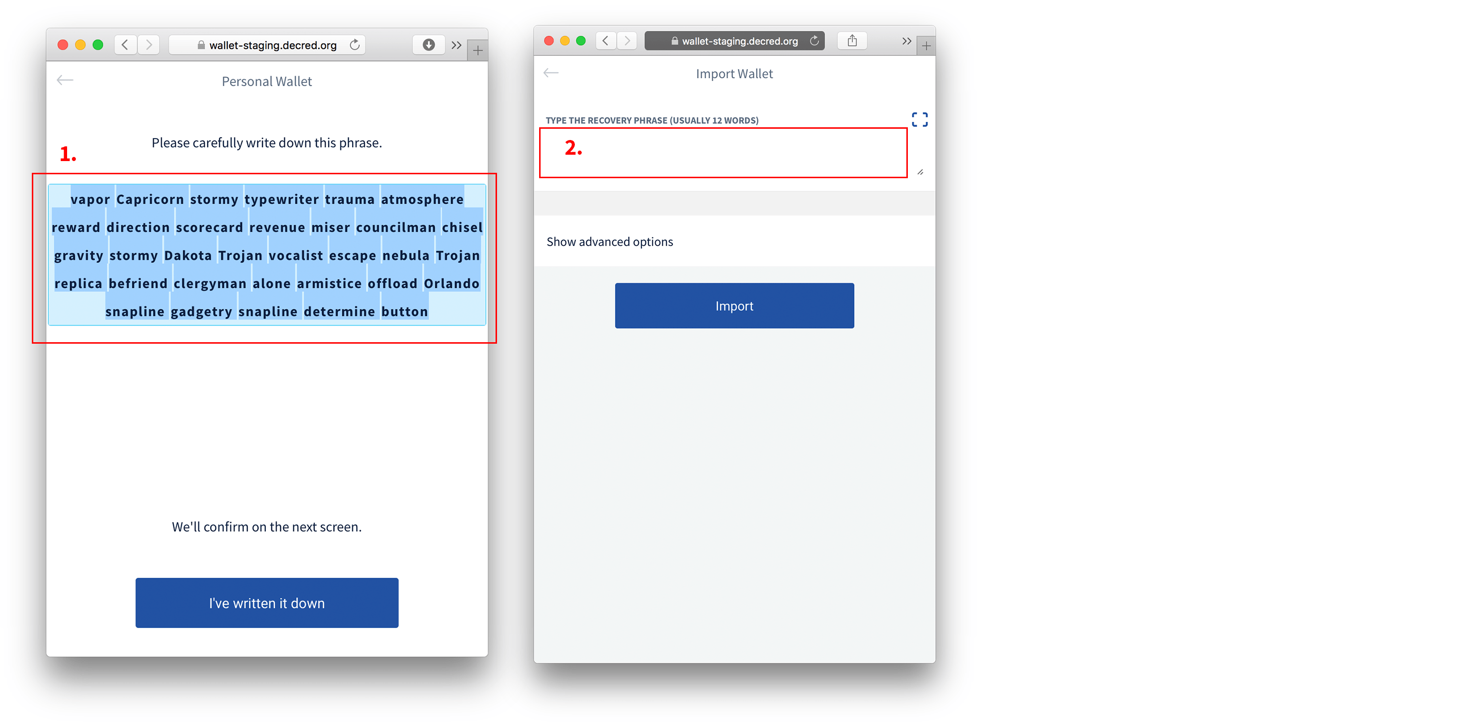 - 2. We need indicate that there's an input field where to type the phrase. This can be a similar grey field as used elsewhere to display the address and amounts.