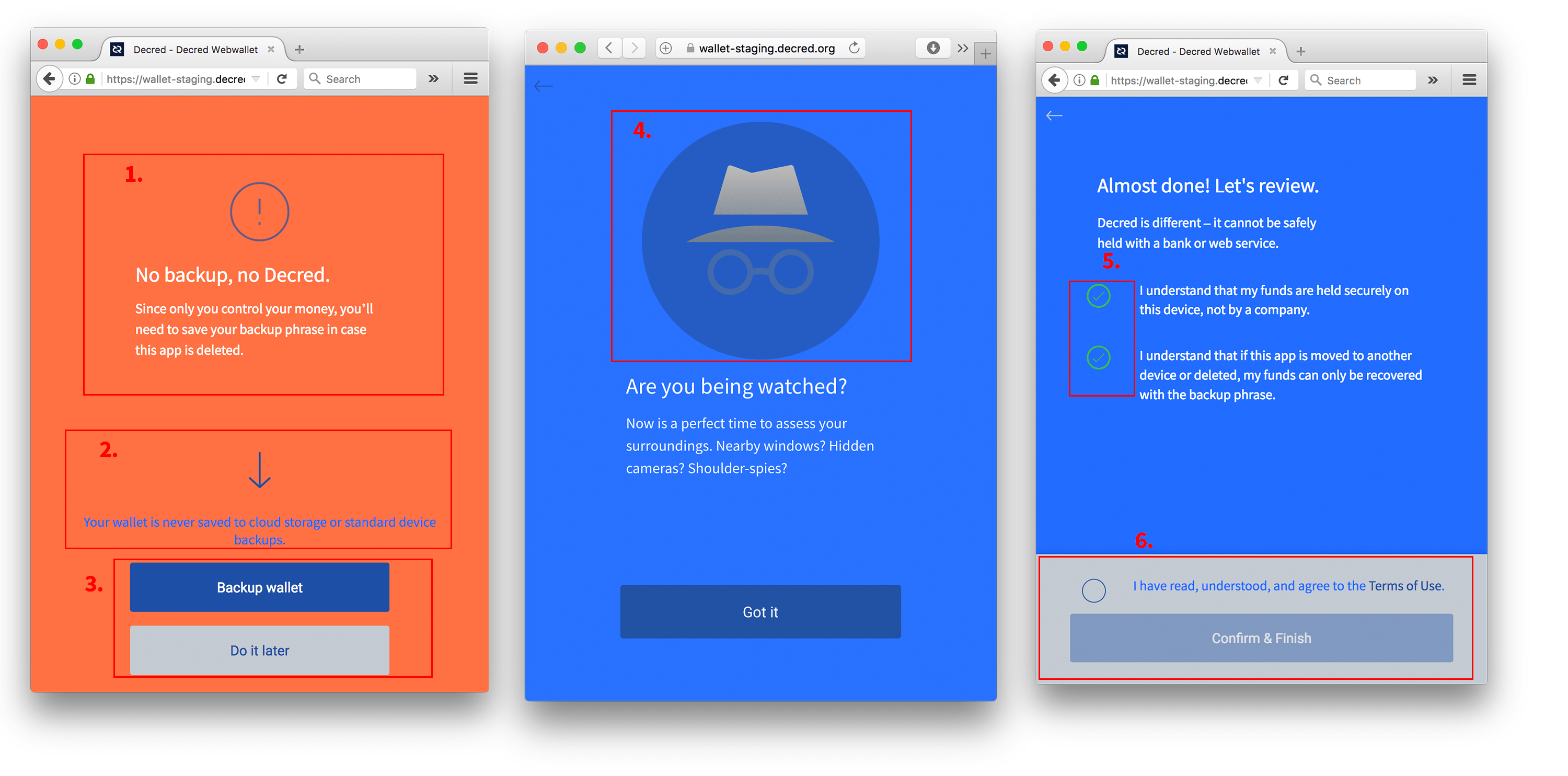 - 1. I think rather than taking a negative note to start with, it needs a different call to action for taking the time to back-up the wallet. Onboarding slides + other reminders should be enough to make it clear that it's important. Will send something later this week + also illustration. Perhaps it can be even combined with the "Are you being watched" view.