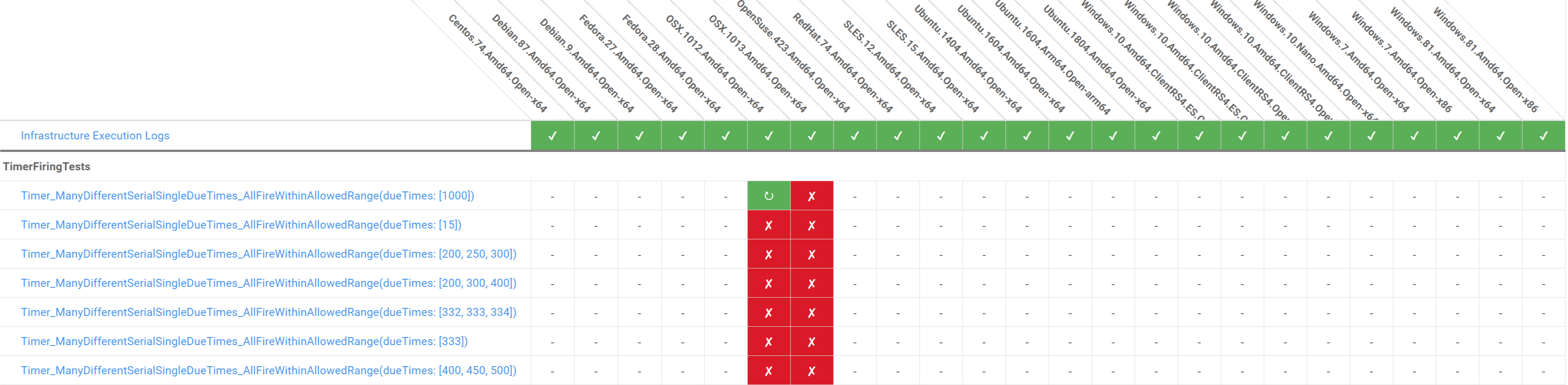 This is interesting, and @kouvel, it may warrant some follow-up. Note that this is all happening before my changes in dotnet/coreclr#20302, which haven't been consumed into corefx yet. For now, I'm going to disable the affected test on macOS in order to get this PR merged. This PR adds several new tests for Timer, but most importantly, it adds a test that runs a bunch of single-fire timers and measures how long they take to fire. For each timer, it allows for a 50ms buffer. If at least 90% of the timers all complete within that buffer from their expected due time, the test passes; if more than 10% don't, the test fails. On Windows and Linux, they've all passed every time CIs run them. On macOS, all but one of the InlineDatas has failed every time CIs run them. I augmented the test to output diagnostic data in case of failure, so that for each dueTime, we can see what the actual failing times were. They're below: TimerFiringTests/Timer_ManyDifferentSerialSingleDueTimes_AllFireWithinAllowedRange(dueTimes: [1000]): Timer_ManyDifferentSerialSingleDueTimes_AllFireWithinAllowedRange(dueTimes: [15]): and Timer_ManyDifferentSerialSingleDueTimes_AllFireWithinAllowedRange(dueTimes: [200, 250, 300]): and Timer_ManyDifferentSerialSingleDueTimes_AllFireWithinAllowedRange(dueTimes: [200, 300, 400]): and Timer_ManyDifferentSerialSingleDueTimes_AllFireWithinAllowedRange(dueTimes: [332, 333, 334]): and Timer_ManyDifferentSerialSingleDueTimes_AllFireWithinAllowedRange(dueTimes: [333]): and Timer_ManyDifferentSerialSingleDueTimes_AllFireWithinAllowedRange(dueTimes: [400, 450, 500]): and There could of course be reasonable explanations for this. Maybe the macOS devices are more underpowered than the Windows and Linux VMs used in CI. Maybe they're more affected by other tests running concurrently in CI. Maybe the machines were busy doing other things as well, more so than for Windows and Linux, and is skewing things. My concern is that maybe there actually is something in either the PAL or the thread pool on macOS that's contributing. |