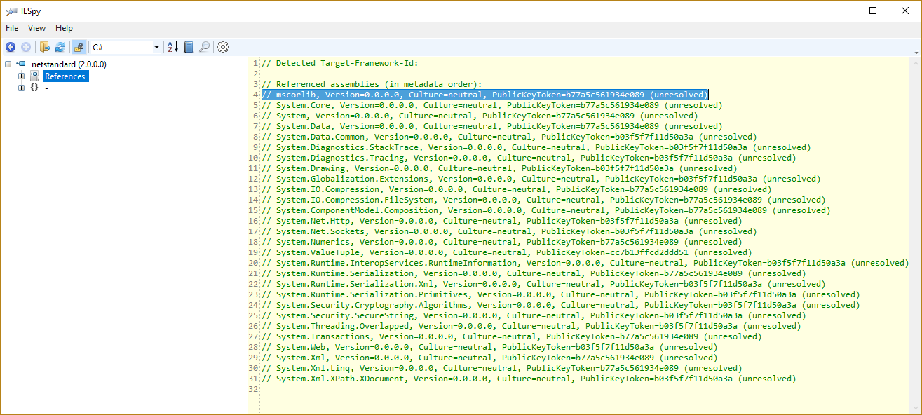 The reason this works in standalone ILSpy is that we manually look for an assembly with the same name but different (= latest) version in the GAC directories if the version is set to 0. See https://github.com/icsharpcode/ILSpy/blob/master/ICSharpCode.Decompiler/DotNetCore/UniversalAssemblyResolver.cs#L134 (note that this code was adapted from Mono.Cecil). The IAssemblyResolver implementation used in Roslyn replaces all this special behavior. I think this is another instance of the problem: "Please tell me which assemblies would be loaded when executing the code in the assembly being decompiled.", because netstandard.dll is similar to a reference assembly. |