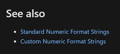 | /// <related type="Article" href="/dotnet/standard/base-types/standard-numeric-format-strings">Standard Numeric Format Strings</related> |