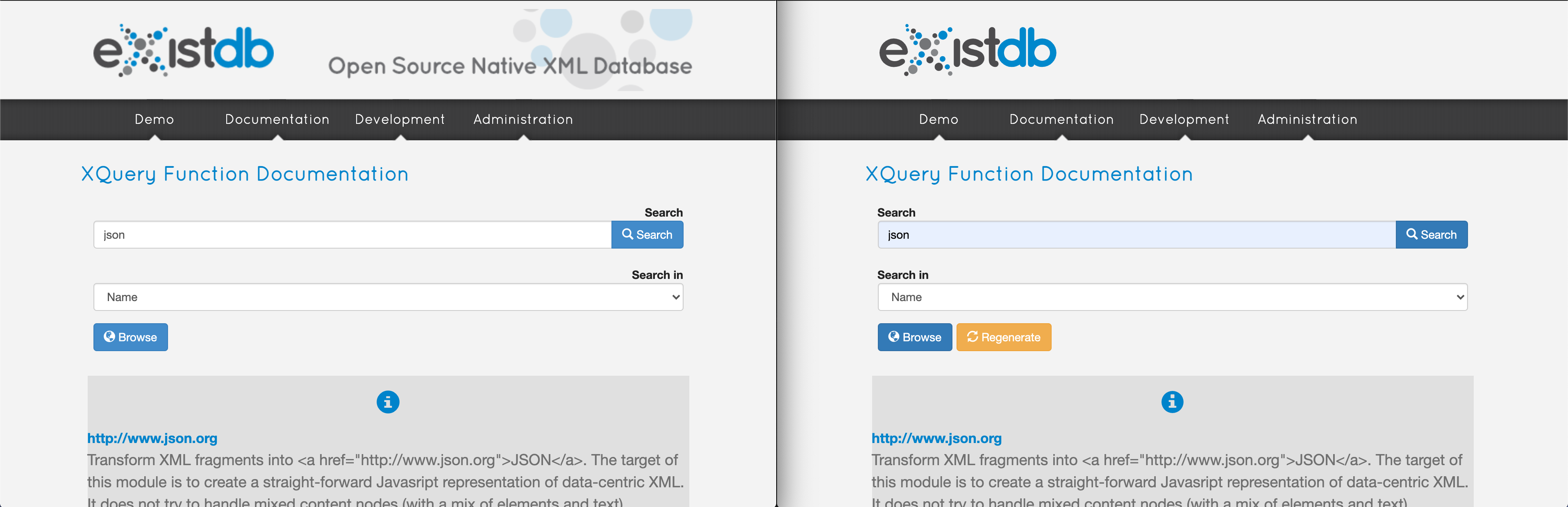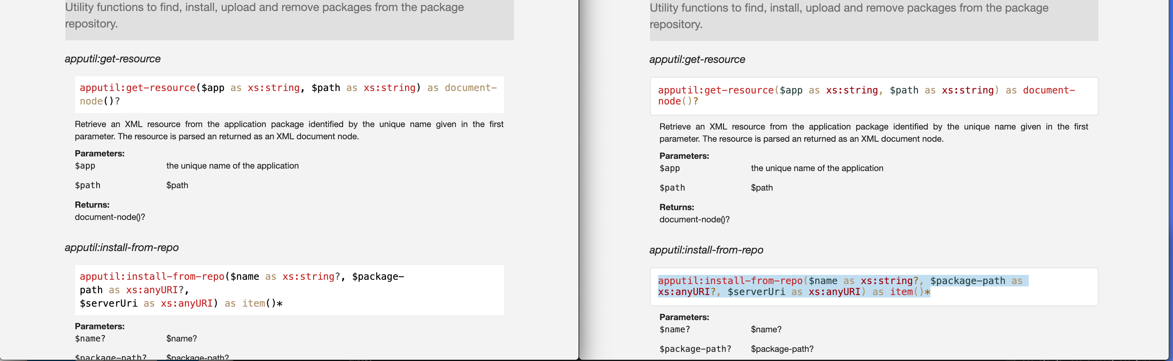 exist.css, a few background images and SVGs and one xquery moduledbutil.xqm).Since the previously used ACE editor theme "Clouds" is not available for prism a custom theme was built. It aims to highlight function name variables, their types, modifiers and the return type of the function in question (for a side by side comparison see the screenshot below).