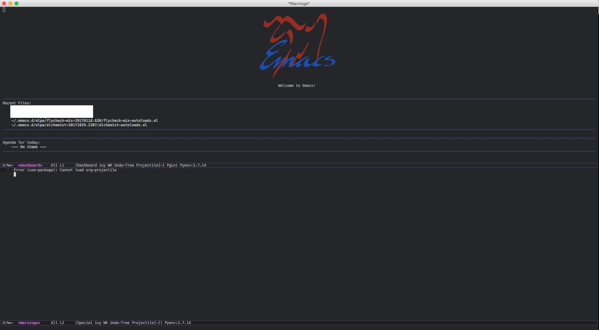 # OS macOS 10.13.1 # Issue Show `Error(use-package): Cannot load org-projectile`  # Reason https://emacs.stackexchange.com/a/37885/18080