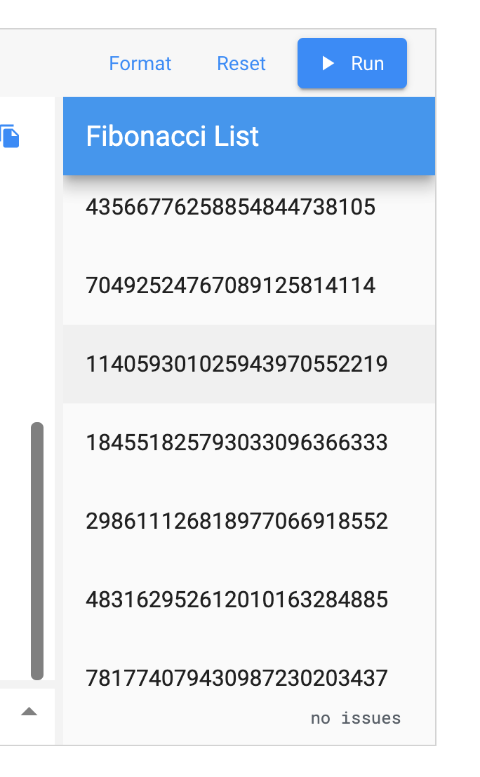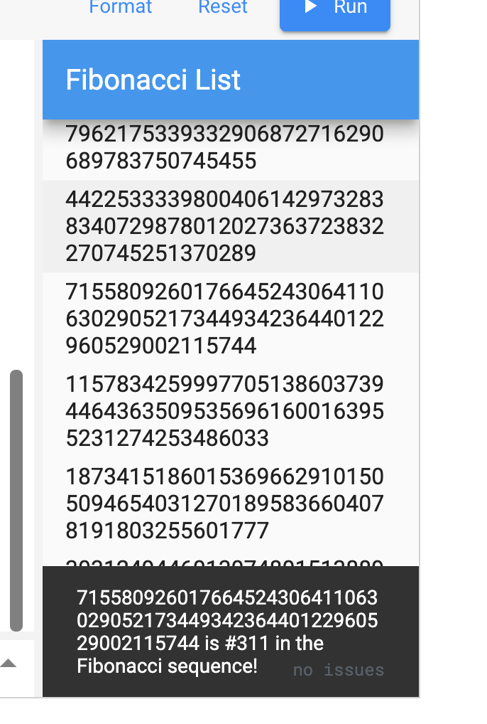 BigInt. And it shows attention to detail — Dart does think of big integers.This will continue computing fib until the number fits into memory. Nobody will scroll that far.