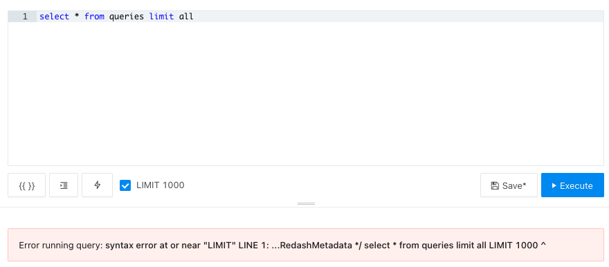 Cannot execute a query with "limit all" while auto-limit is checked.