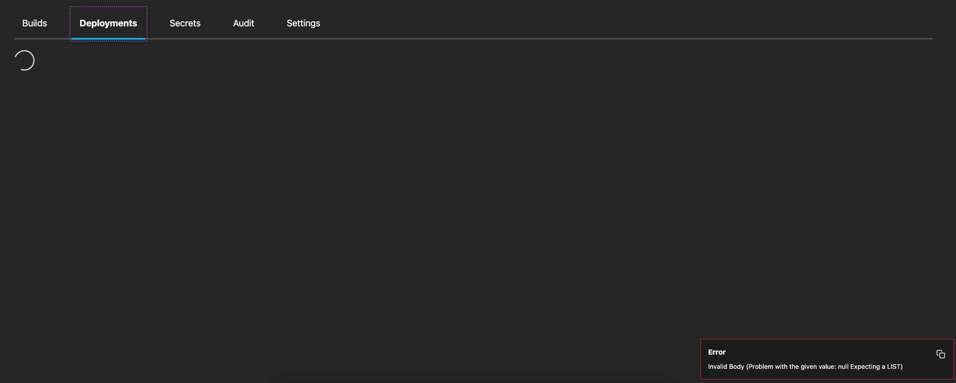 Deploymentstab in the UI, you'll see an "infinite" spinning wheel with the TOAST error message:The reason for this issue is due to us creating an empty slice of deployments as a variable