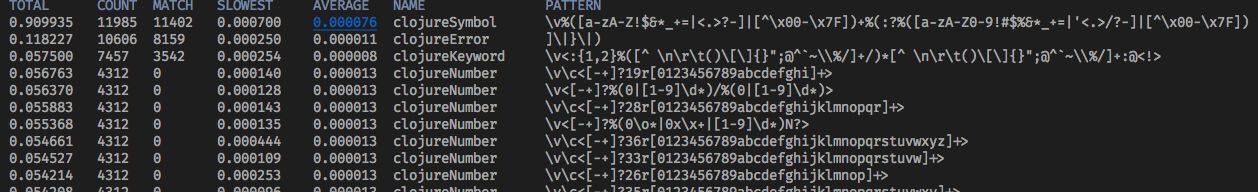 I disabled all plugins and found than clojureSymbol regex take most time when working with clojure file.