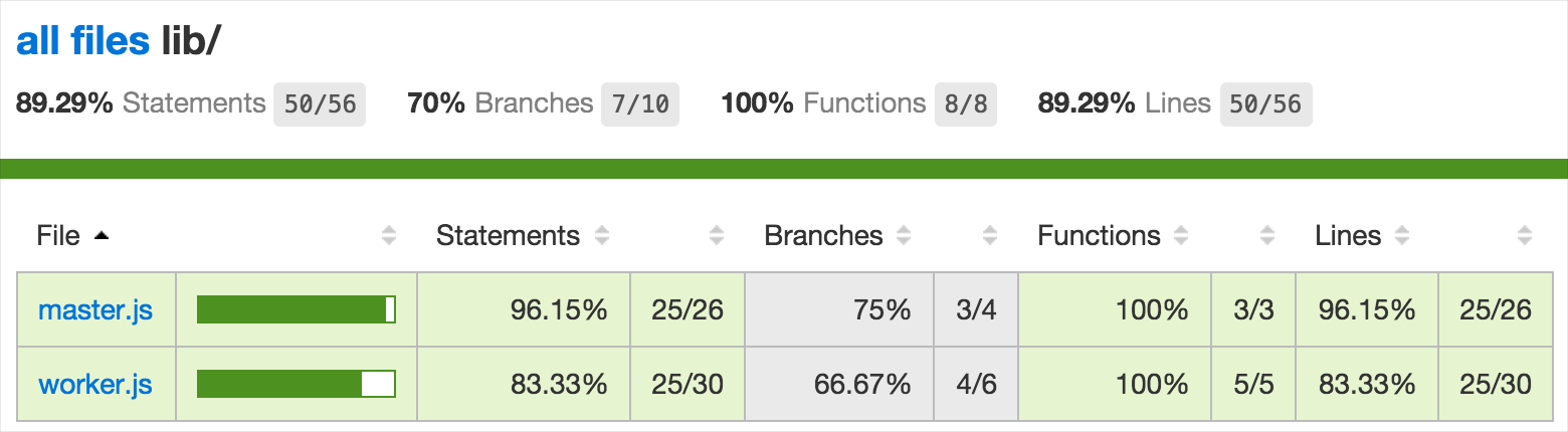 可以看出 instrument 后的代码每一行是否被执行都可以监测到,而 worker.js 是 master.js 通过调用 childProcess.fork, 在一个很干净的 Node.js 环境中执行, 执行的代码没有被 instrument,执行情况自然无法被 Istanbul 检测到。