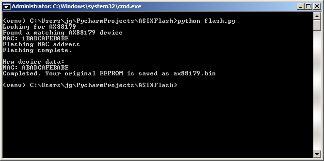 python flash.py. This will flash your device with the new MAC address. - At this point, your device should have been flashed successfully. The original EEPROM will be saved as