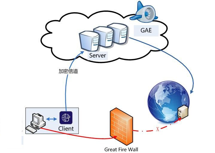 goagent !> goagent已停止维护并清空了相关仓库,基于此的相关衍生项目xx-net自身问题颇多,且含有服务质量低下的付费功能,并不推荐使用 GoAgent通过使用GAE的服务器作为中转绕过了GFW。它的运作流程是浏览器代理设置将请求的数据重定向到client,对数据加密后并发送到GAE的server,再将数据解密并请求需要的数据回传给client。