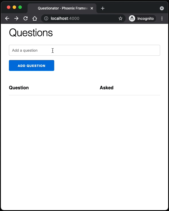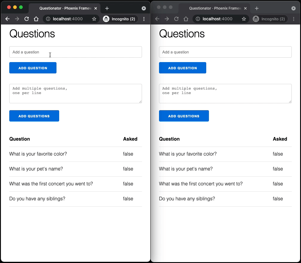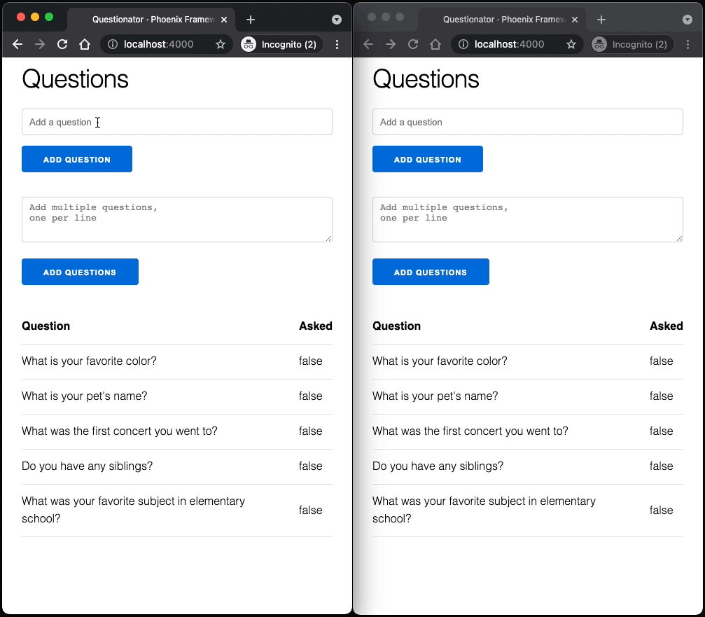 For our case, we'll broadcast a message when the state of the database has changed, and our LiveView component will listen for those messages, updating the page with the new data. For example, if we open up another localhost tab and add a question, that question will not be automatically added to the other tab: