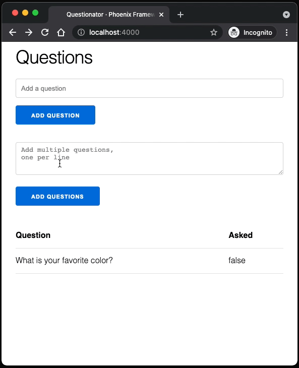 In this post, we'll build a LiveView app using Phoenix generators that will allow users to add questions to a list, mark whether or not they've been asked, and reset the question so that it can be asked again.