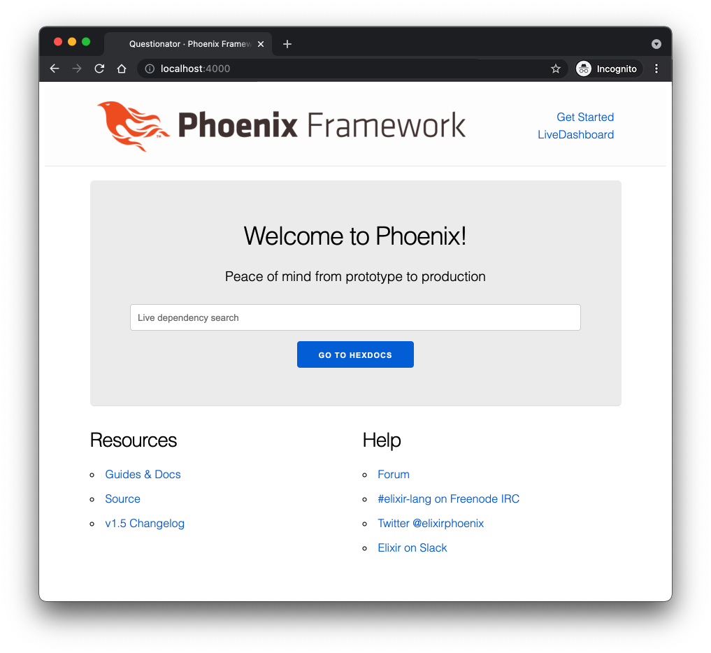 Let's get this server running with mix phx.server and navigate to http://localhost:4000 to bask in the glow of a new Phoenix app!
